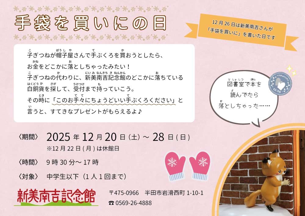 新美南吉は12月26日に「手袋を買いに」を書きました。これにちなんで、12月下旬から中学生以下を対象に記念イベントを開催します。