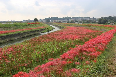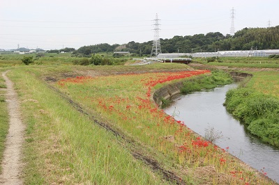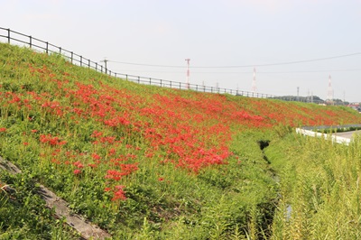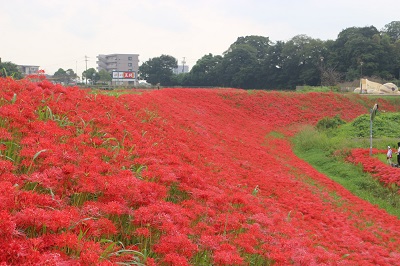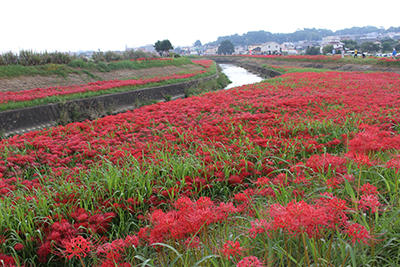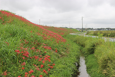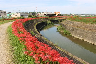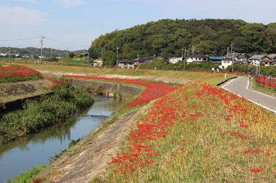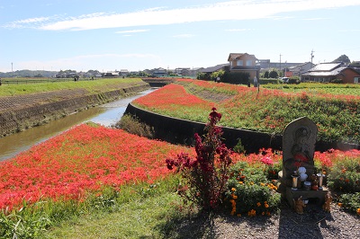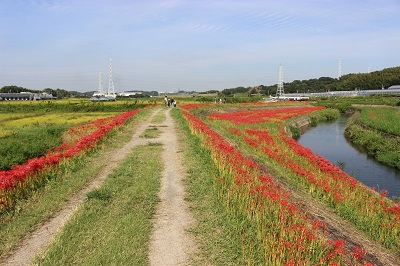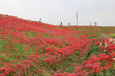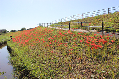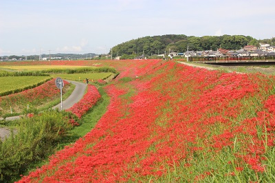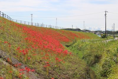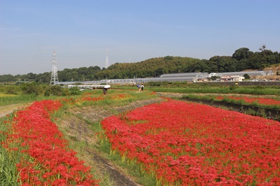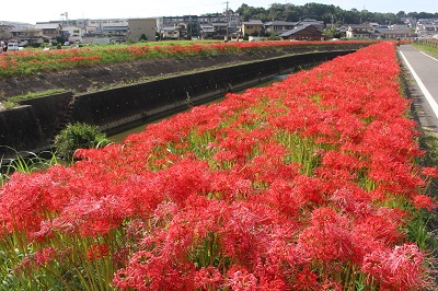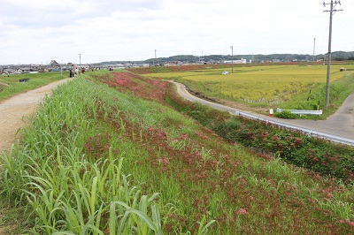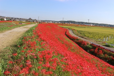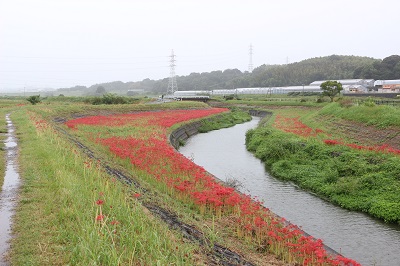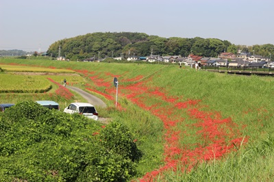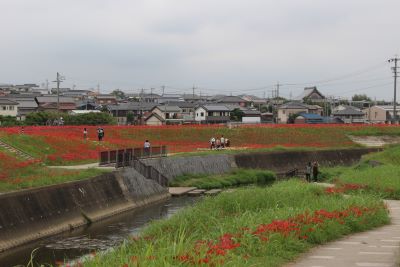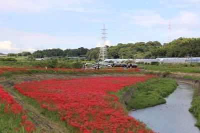 阿久比町側でほぼ満開を迎え「赤い絨毯」が広がっています