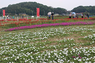 今年も猛暑により開花が遅れました。彼岸を過ぎた9月末頃から咲き始め、10月初めにかけて順次見頃を迎えました。場所によって見頃にズレはありましたが、「ごんの秋まつり」が終わる頃には色褪せたり、枯れたりする花が目立ちました。
