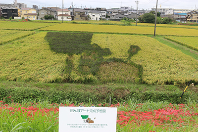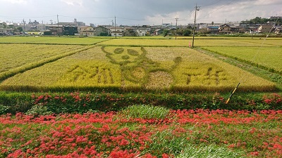 田んぼアート「ごん吉くん」の絵が綺麗に浮かんでいます