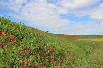 2019年は記録的な残暑となり、暑さで彼岸花がなかなか出てきませんでした。彼岸を過ぎても芽さえ出ないほどで、見頃のピークとなったのは9月29日、30日頃。代わりに10月に入ってもしばらく楽しめましたが、日当たりの良い南向きの斜面は最後までまばらな咲き具合でした。