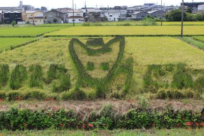 今年の田んぼアートは南吉童話「牛をつないだ椿の木」